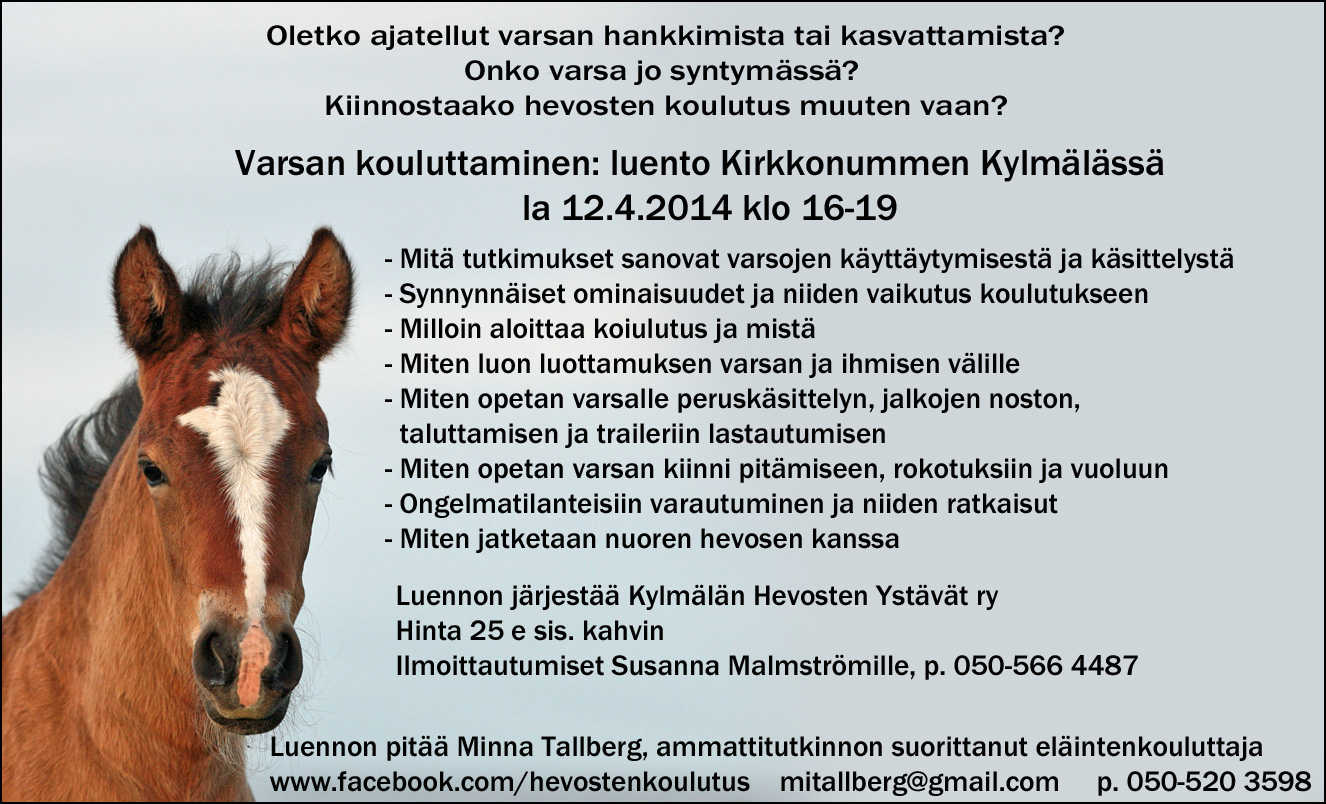 Varsaluento Kirkkonummen Kylmälässä 12.4.2014 kello 16-19. Ilmoittautumiset Susanna Malmström, p. 050-566 4487. Järjestää Kylmälän Hevosten Ystävät ry.