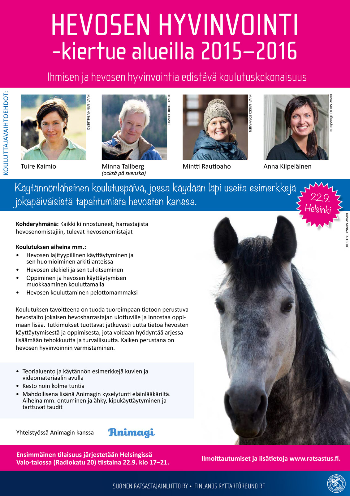Pääsemme yhdessä Tuire Kaimion, Anna Kilpeläisen ja Mintti Rautioahon kanssa toteuttamaan hevosen hyvinvointiin ja koulutukseen liittyvän luentosarjan yhteistyössä Suomen Ratsastajainliiton kanssa. Ensimmäinen tapahtuma on meidän kaikkien ainutkertainen yhteisluento, jossa paikalla on myös Animagin eläinlääkäri puhumassa hevosen terveydestä.