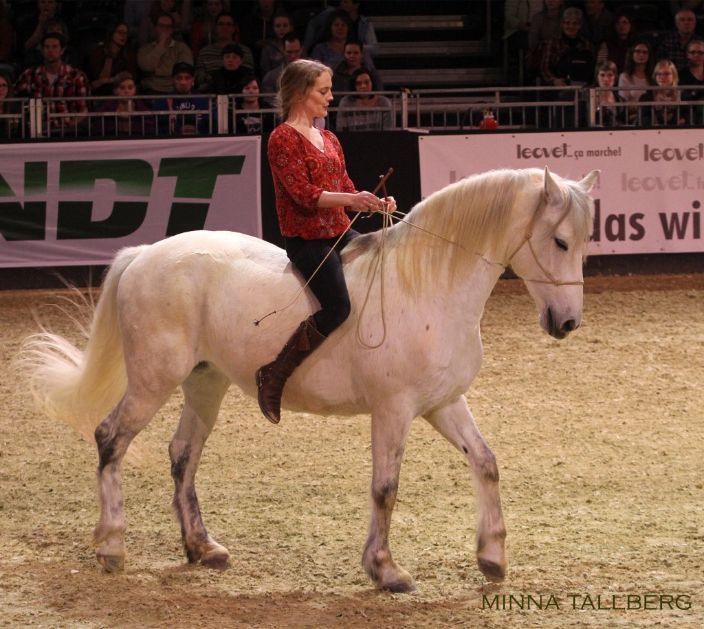 Hevonen käynnissä, kootummassa sellaisessa. Kyllä, olen sitä mieltä, että esiintyvien taiteilijoidenkin olisi hyvä käyttää kypärää ja satulakin on hevosen selälle hyväksi. Mutta vaikka häntä vähän viuhuukin, mielestäni tuo on erinomainen kuva puhtaasta, nelitahtisesta, kootusta käynnistä. Muista tämä jalkojen asento.
