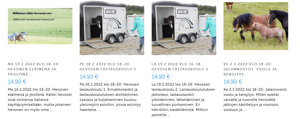 Ei haittaa, kyllä tulee tallenne. Joskus – esimerkiksi nyt Hevosen peruskäsittelywebinaarin kohdalla – tallenne viivästyy, kun pitää löytyä aikaa tallentaa se uudelleen. Tulossa on kuitenkin ja katseluaikaa on aina sen kuukauden ilmestymisestä tai jos tallenne on jo olemassa, ostopäivästä.