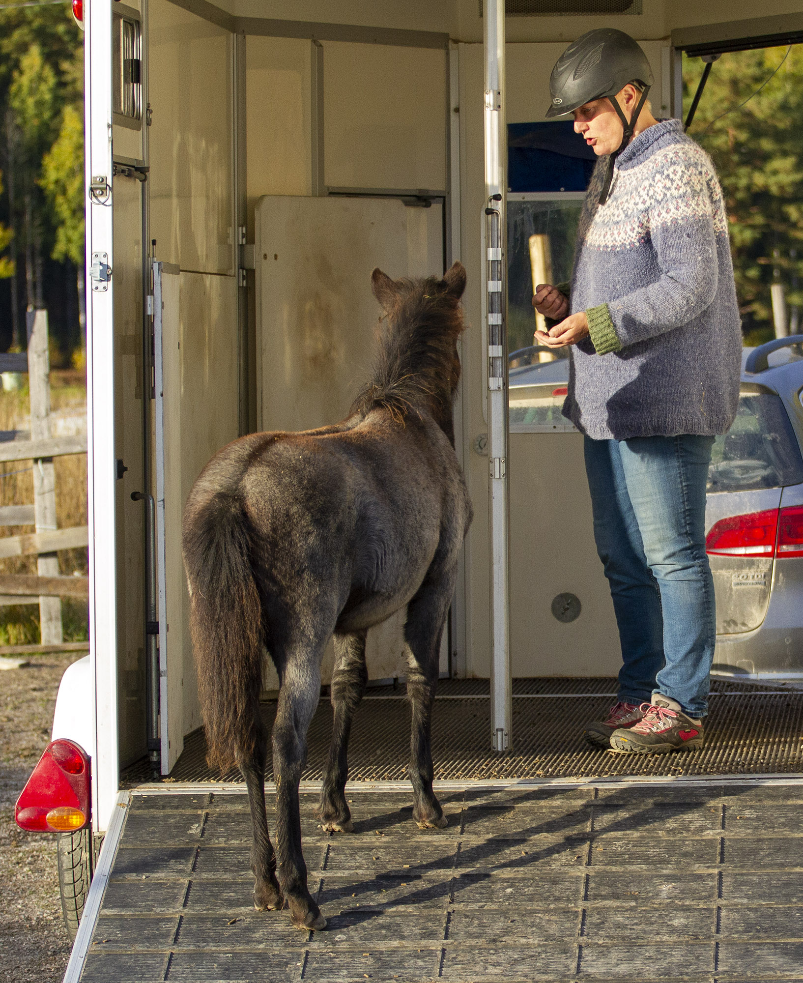 Jos saisin päättää, kaikille maailman hevosille ensimmäiset lastauskerrat olisivat juuri tällaisia. Vapaus harjoitella asentotuntoaan eli miten sillalle astutaan ja miten peruutetaan sieltä pois. Paljon ihania asioita sisällä, oli ne rapsutuksia tai sitä ruokaa, mitä muutenkin syödään. Ei vielä matkustamista. Ja sitten yksi asia kerrallaan emän kanssa: sulkeminen ja seisomiseen rutiini. Jos jokainen hevonen kävisi trailerissa syömässä aamupalaa kolme kertaa viikossa, lastausongelmia olisi paljon vähemmän.