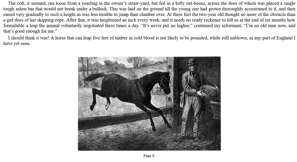 The colt, it seemed, ran loose from a yearling in the owner’s straw-yard, but fed in a lofty out-house, across the door of which was placed a single tough ashen bar that would not break under a bullock. This was laid on the ground till the young one had grown thoroughly accustomed to it, and then raised very gradually to such a height as was less trouble to jump than clamber over. At three feet the two-year old thought no more of the obstacle than a girl does of her skipping-rope.