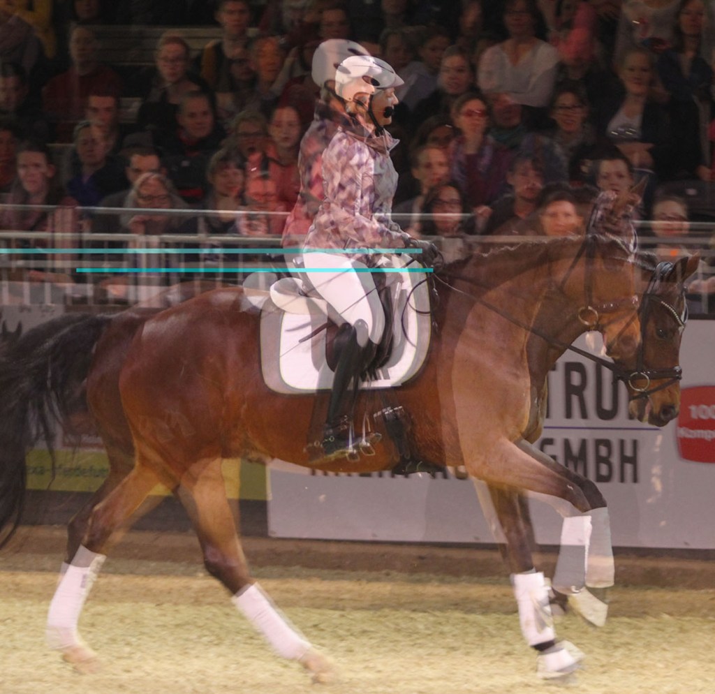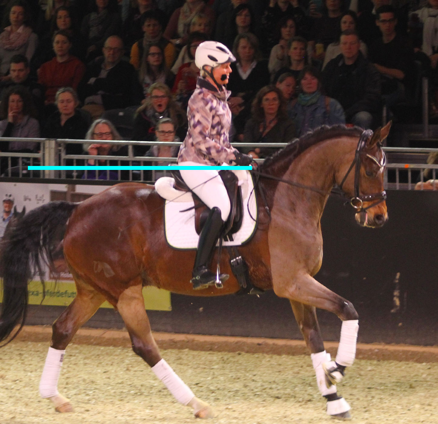 Tässä vielä ensimmäinen kuva apuviivan kera. Hevosen rakeenteestahan riippuu esimerkiksi se, miten korkealla sen okahaarakkeet sä’än kohdalla ovat, joten pelkästään sä’än ja takaosan korkeimpia kohtia vertaamalla ei voida verrata eri hevosia keskenään. Samaa hevosta kylläkin, koska sen perusrakenne ei kuvien välissä muutu. Nykyään jalostetaan kouluhevosia, jotka jo kolmivuotiaina näyttävät liikkuvan kootusti, koska niiden rakenne hämää meitä uskomaan näin. Synnynnäisesti korkea säkä voi antaa illuusion oikein liikkuvasta hevosesta, ja lyhyt runko kokoamisesta, vaikka hevonen ei olisi vielä kykeneväinen liikkumaan itselleen terveellisellä tavalla ratsastajan alla.