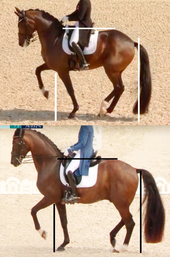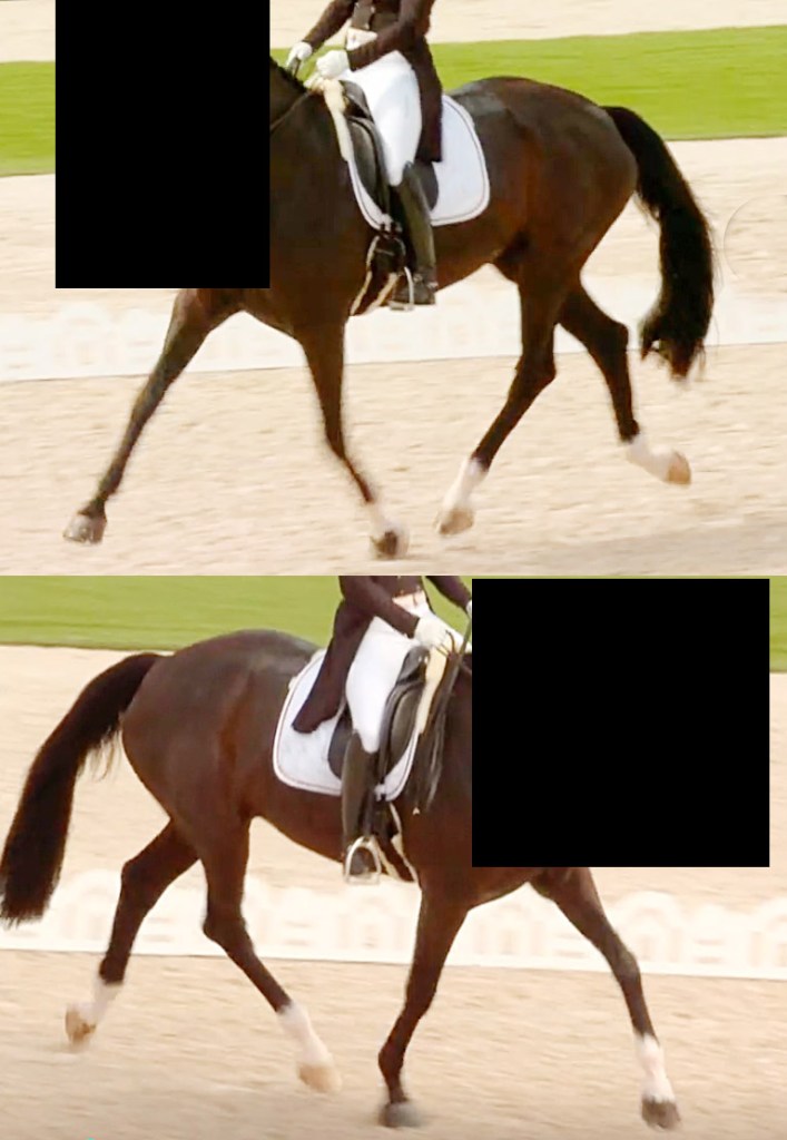 Tämä kuvaparin tarkoitus oli näyttää se, että jos hevosta laitetaan nopeuttamaan tai suurentamaan ilmassa olevan takajalan liikettä se voi johtaa siihen, että paino siirtyy enemmän eteenpäin. Tämä tekee siirtymisistä vaikeampia. Klassisessa kirjallisuudessa puhutaan ”pukki kivellä” -kokoamisesta eli siitä, että hevosen etu- ja takajalat lähestyvät toisiaan ilman, että hevonen varsinaisesti tule parempaan tasapainoon.