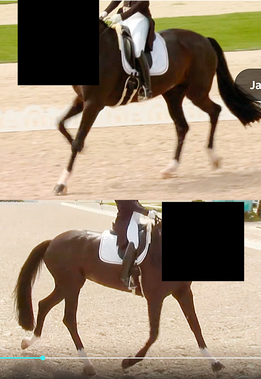 Katselin muutamia ratsukoita olympiakouluradalla ja osalla tämä epäpuhdas raviliike oli suuri, osalla pieni. Se näkyy usein selkeimmin lisätyssä ravissa ja ainakin niissä ratsukoissa mitä katsoin korreloi vahvasti myös passagen puhtauden kanssa.