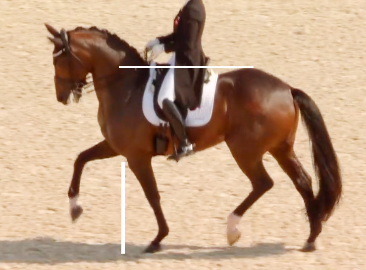 Kuvista ja hidastetuista videokuvista tämän näkee selvästi. Mihin hevosen runko on menossa? Kaaressa ”eteen-ylös” vai ”alamäkeen”? Tässäkin hevosen rakenne vaikuttaa, tosin jos katsot olympialaisia lienee kohtuullista todeta, että kaikkien hevosten rakenne on korkeimmalle tasolle sopiva.